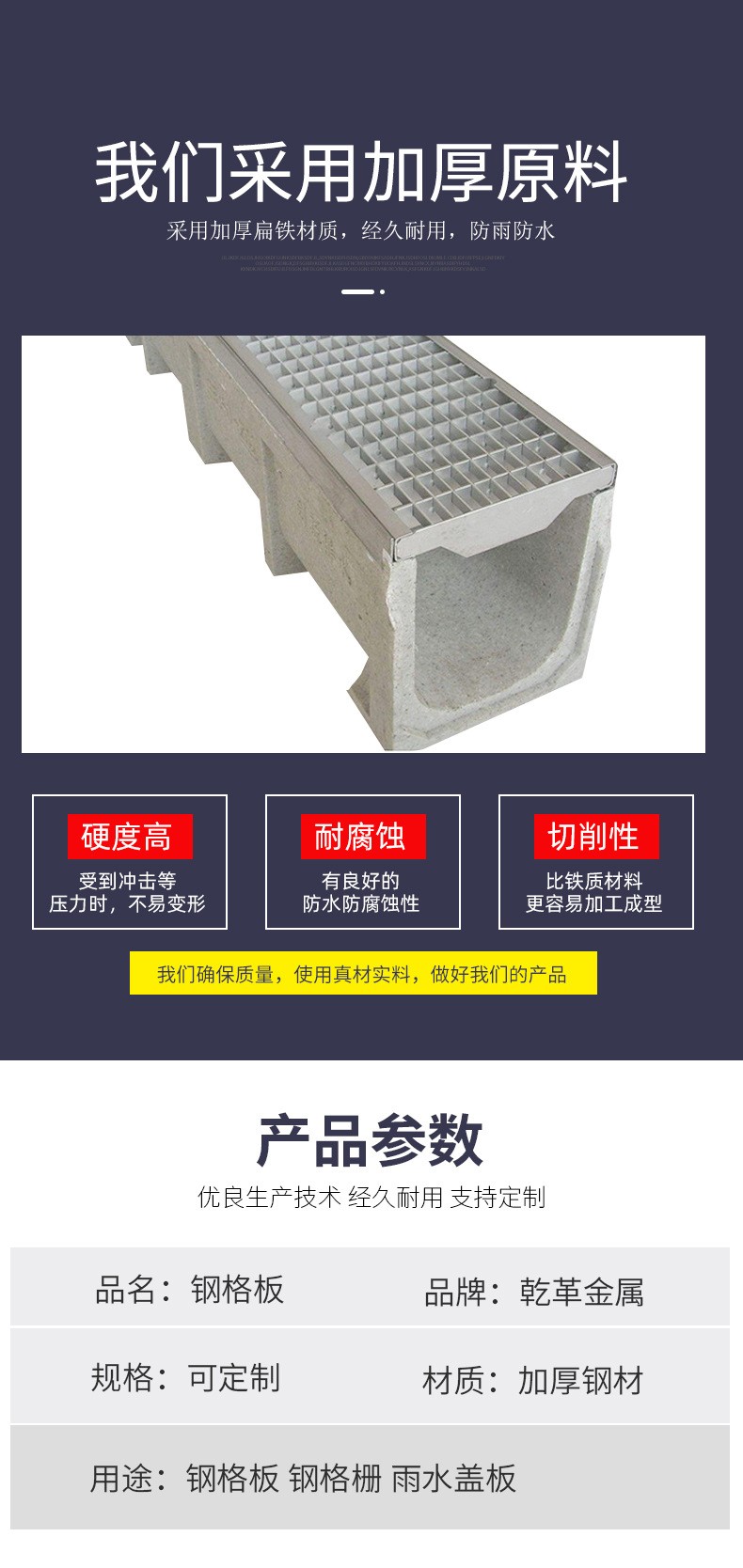 上海乾革金屬制品有限公司位于上海市松江區(詳情請咨詢18964233255)。我公司是一家集科研、生產、商貿于一體的大型絲網企業。公司主要生產銷售的產品有:玻璃鋼格柵、鍍鋅鋼格板、熱鍍鋅鋼格板、平臺鋼格板、互插鋼格板、溝蓋板、踏步板、地溝蓋板、不銹鋼井蓋、不銹鋼線性排水溝、樹脂排水溝、不銹鋼格柵、不銹鋼溝蓋板以及雨水篦子等;